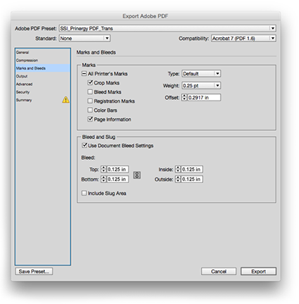 When exporting a high-quality print PDF from Adobe InDesign, be sure to include crop marks, page information and bleeds of 0.125 in. Also, set offset as 0.2917 in. Doing so will produce a PDF with even 0.5” space around all sides to accommodate trims.